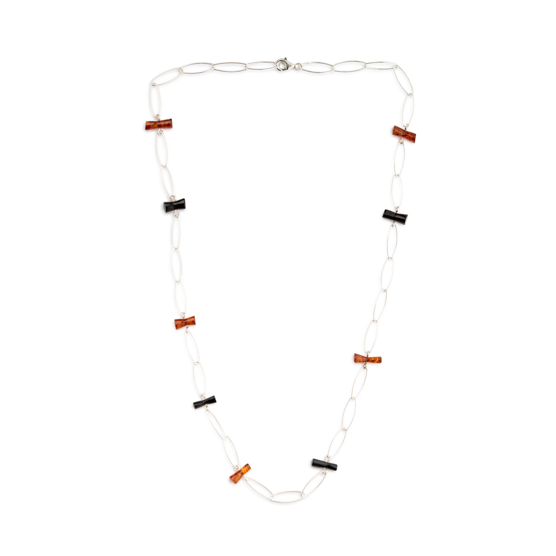 Collana lunga in argento 925 composta da maglie ovali leggere, intervallate da piccole barrette orizzontali in ambra cognac e in ambra scura. Il design lineare ma dinamico crea un effetto grafico elegante, facile da indossare sia su maglie semplici che su abiti minimal.
