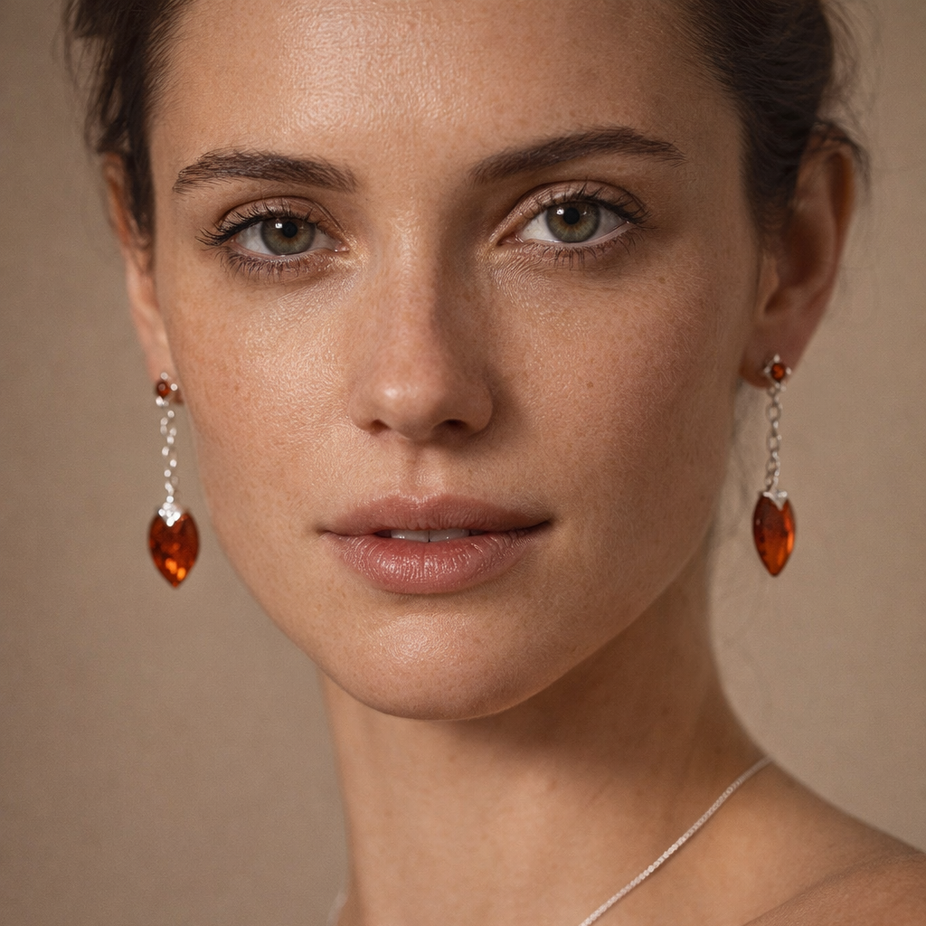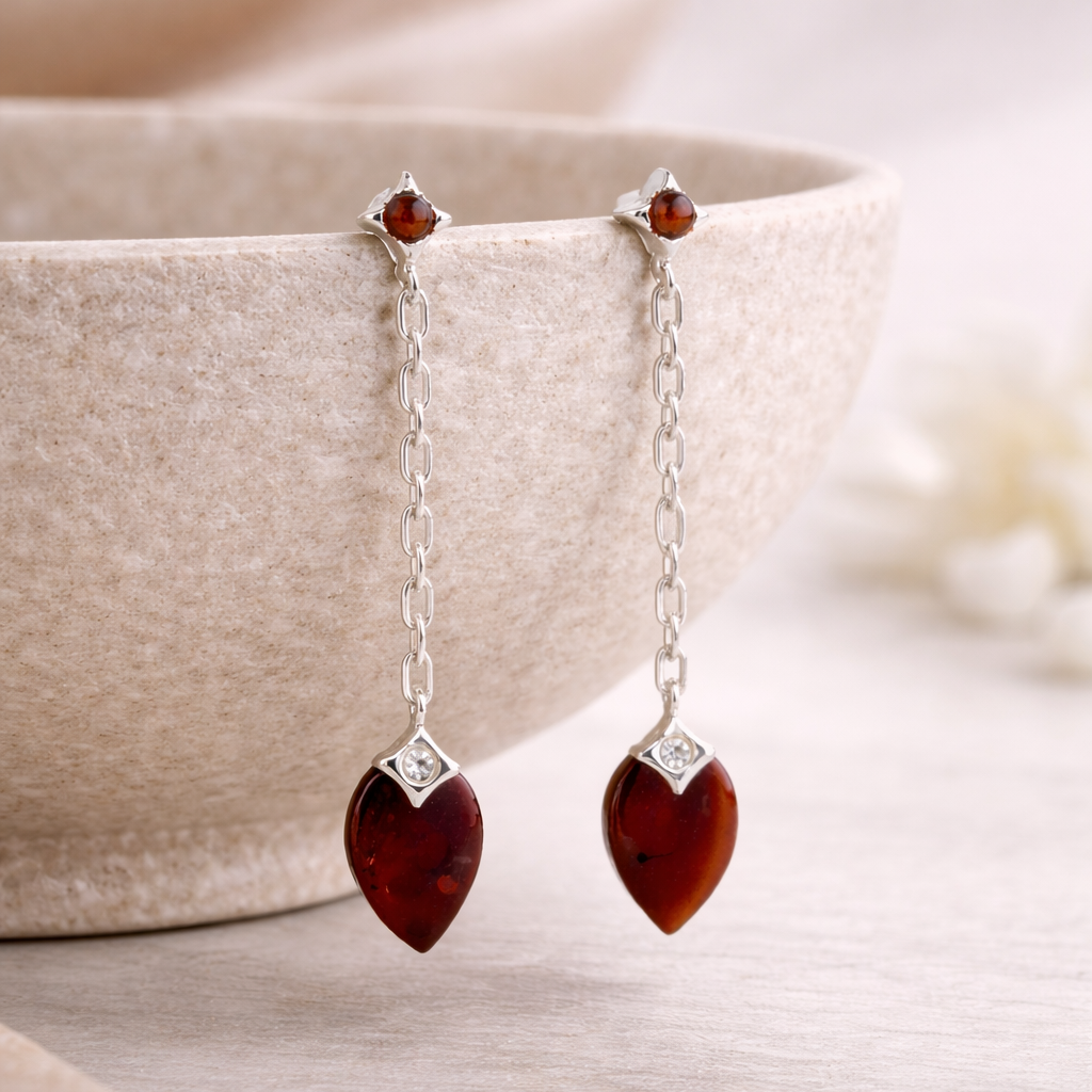 Orecchini Pendenti in Ambra Ciliegia con Catena e Punto Luce