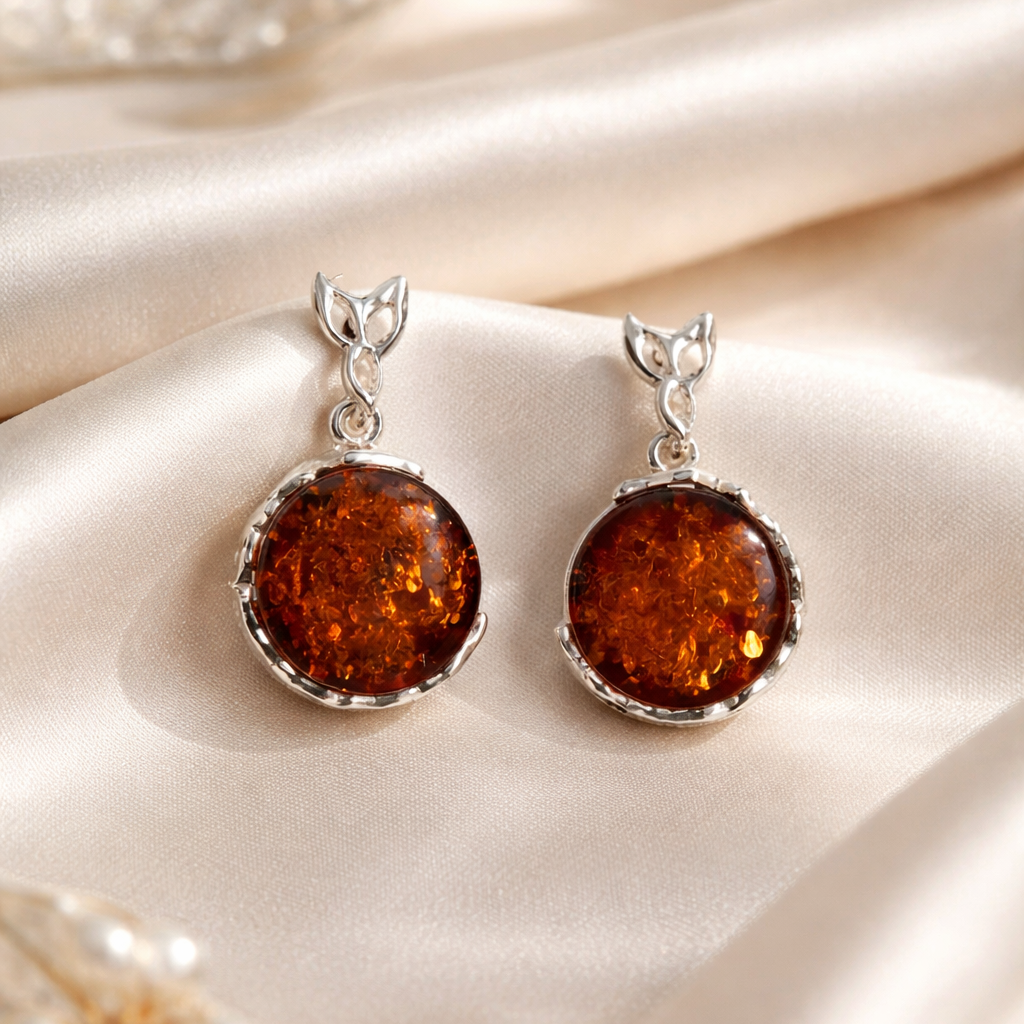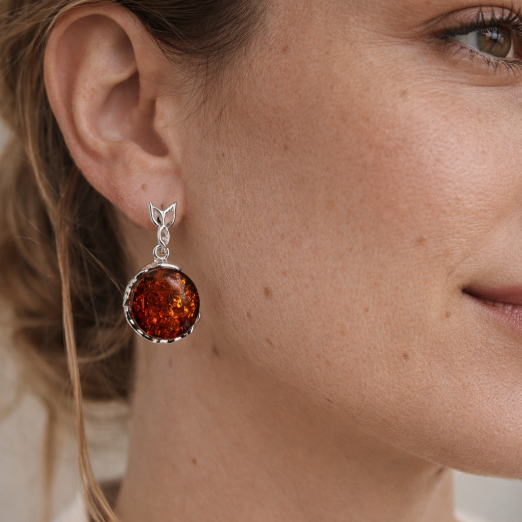 Orecchini Pendenti in Ambra Cognac Rotonda con Cornice Dentellata