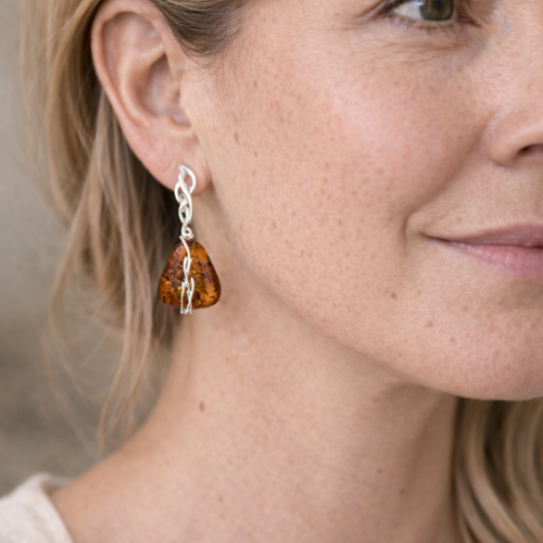 Orecchini Pendenti in Ambra Cognac con Intreccio d’Argento